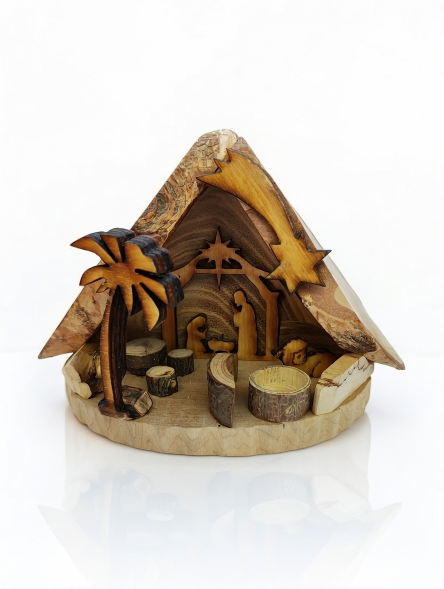 This decoration is a fusion of the raw beauty of untreated wood and delicate craftsmanship. The multilayered composition gives the piece depth, making the scene appear vivid and dynamic. The solid tree trunk base ensures stability and highlights the uniqueness of each piece, as no two wood cuts are ever the same.