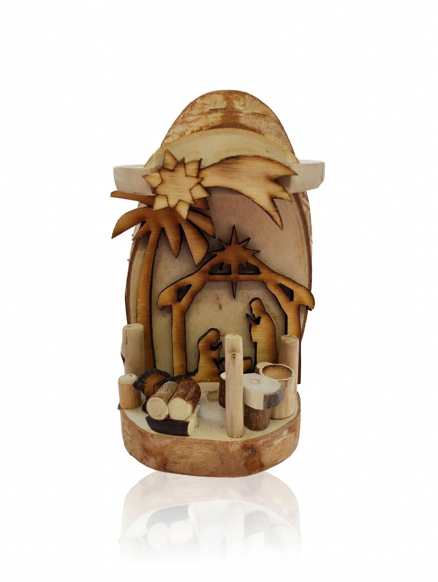 This meticulously crafted Christmas decoration celebrates the beauty of natural materials and traditional craftsmanship. The entire scene is delicately composed of multiple wooden layers, creating an impressive 3D effect. By using a tree trunk section with its natural bark texture, each piece is a unique original that brings a peaceful and warm holiday atmosphere to your home.