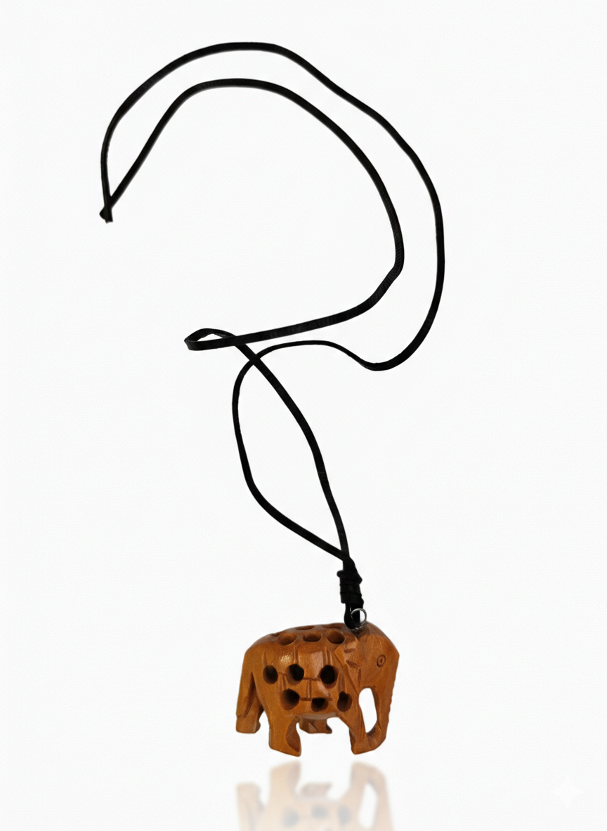 A hand-carved elephant pendant featuring a detailed hollowed-out pattern on its body, giving it a unique ethnic look.