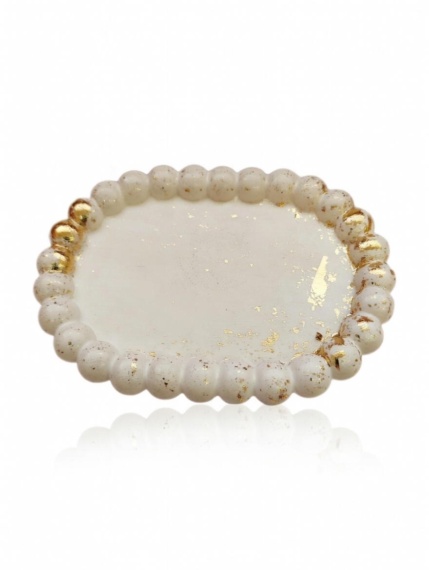 This hand-modeled tray combines delicacy with a luxurious look. Its unique beaded edge gives it a playful yet sophisticated character. Each piece is an original that brings a touch of elegance to your interior, serving as a tasteful decorative element for a vanity or dresser.