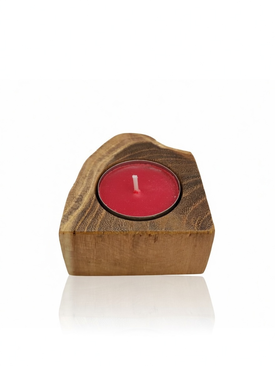 This hand-finished holder is crafted from solid wood, preserving its natural structure and irregular organic shape. The central part features a precisely milled opening housing a red scented candle in a metal cup. High-quality craftsmanship and a smooth surface highlight the minimalist design of this interior accessory.