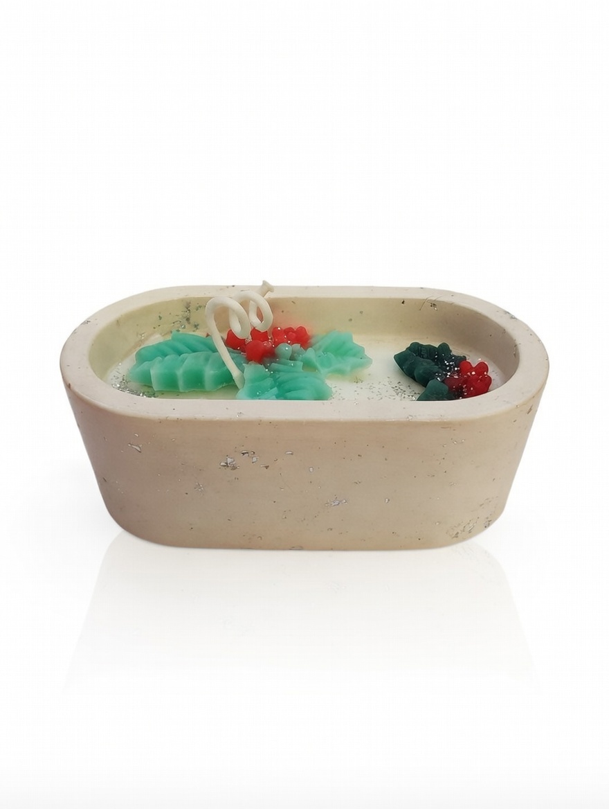 Bring a piece of timeless Christmas tradition into your home. This handcrafted candle, nestled in an elegant oval ceramic container, features detailed wax decorations of holly leaves and vibrant red berries. The surface is lightly dusted with glitter, creating magical reflections that mimic freshly fallen snow as the candle burns.