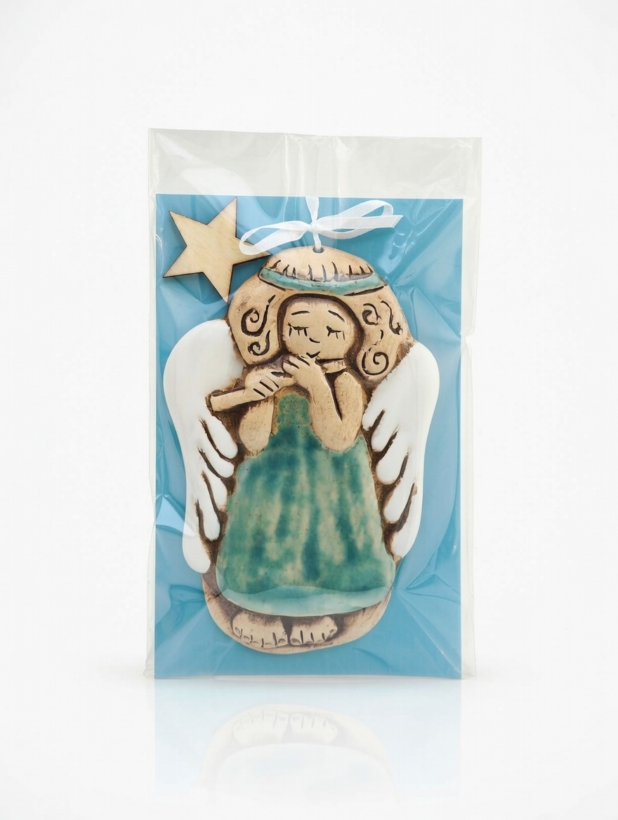 This charming angel is the result of precise manual craftsmanship, with every line of the figure playing the flute sensitively highlighted by a darker contour. The turquoise dress with a glossy glaze contrasts with the white wings and the matte surface of the face. The product is packed in a transparent bag with a blue background and a white ribbon, making it an ideal gift ready for immediate hanging.