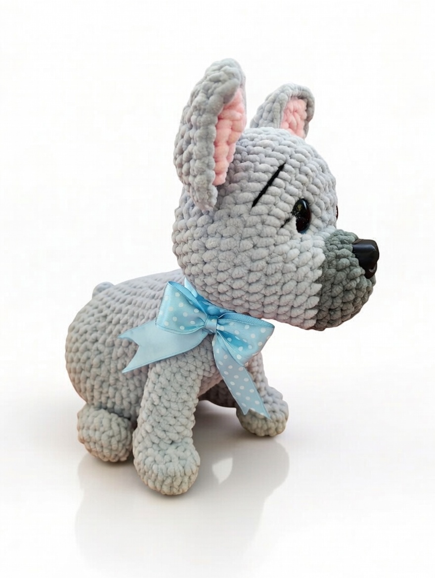 This handmade dog is crafted from a material that stands out for its extreme softness and plushness. The figure is dressed in a cute green hooded onesie, complemented by a cheerful knitted scarf and contrasting red boots with white trim. Thanks to its precise craftsmanship and sweet facial expression, this dog is an ideal companion for a child’s room or an original gift for any handmade craft collector.