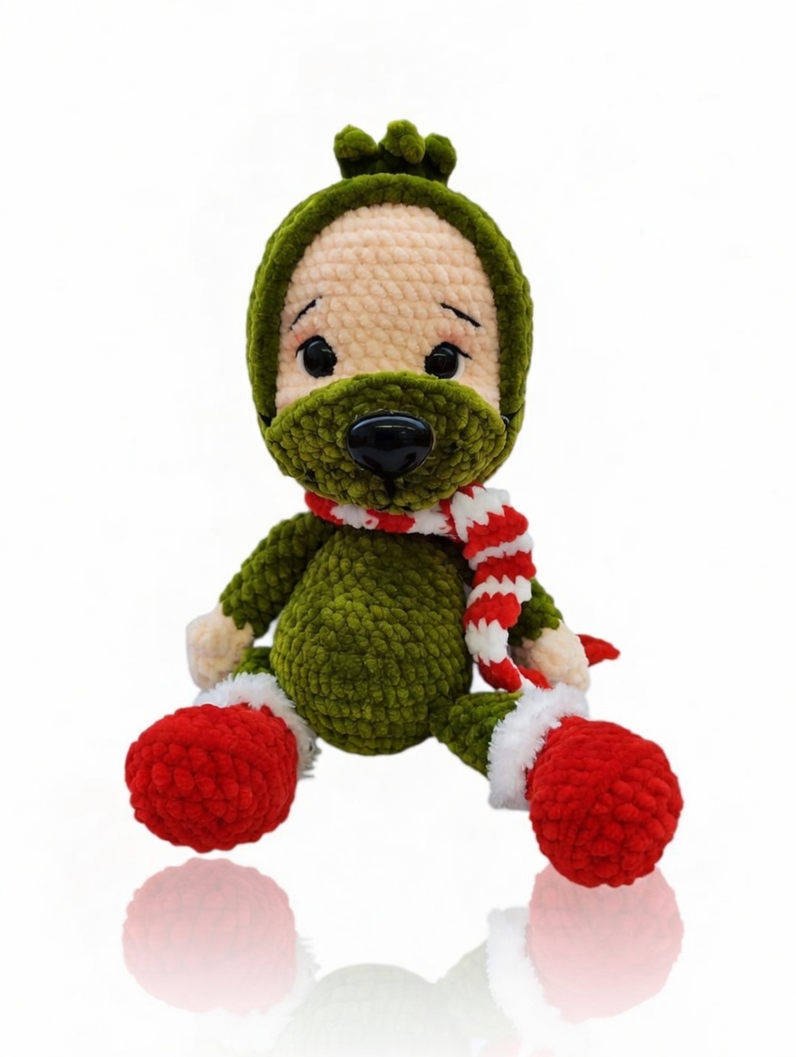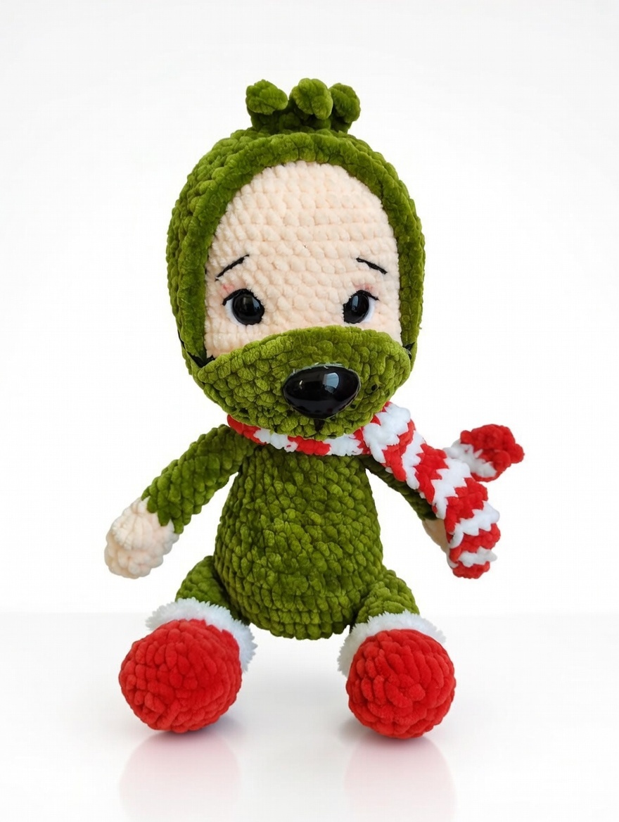 This lovely figure is made of a very soft material that is smooth and plush to the touch. The figure wears a striking green hood and body, complemented by a cheerful striped scarf in a white-red combination and matching red boots. Thanks to precise crocheting and a cute facial expression, it serves as an original decoration for a children’s room or a unique gift for lovers of handmade crafts.