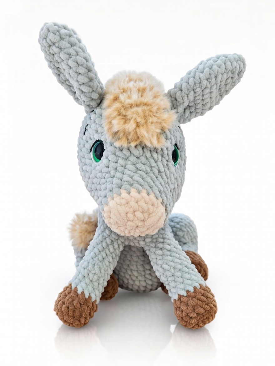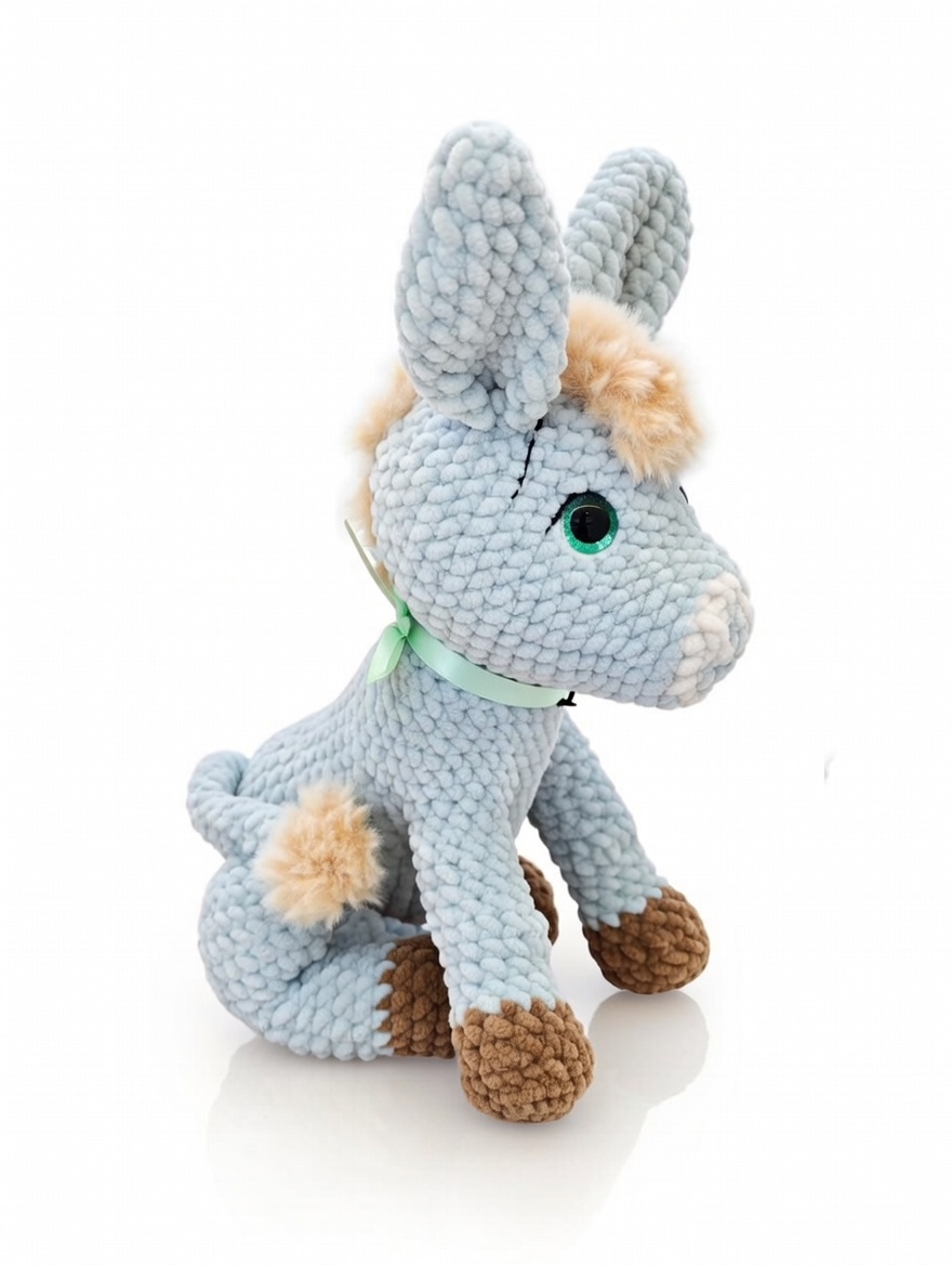 This handmade donkey is crafted from a material that stands out for its extreme softness and plushness. The figure features a cute facial expression with a detailed light snout and long ears that give it a unique character. The overall design is complemented by a functional silver bell and a small decorative ladybug on its back, making it not only a beautiful toy but also an original decorative item for any room.