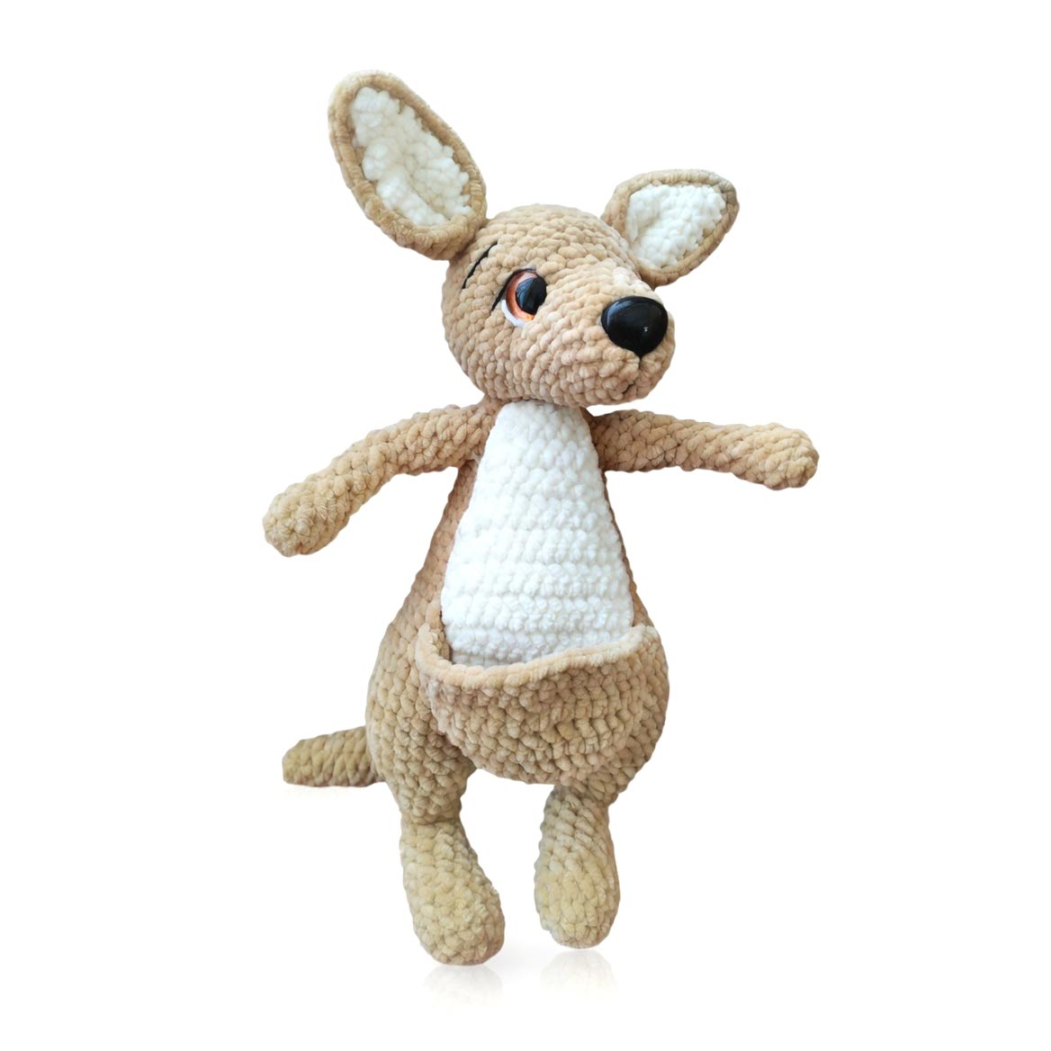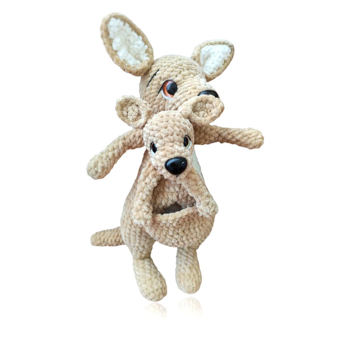 A unique hand-crocheted toy featuring a kangaroo mother with a functional pouch where her adorable joey is hidden. Made from exceptionally soft and plush yarn that is very pleasant to the touch, making it perfect for cuddling.