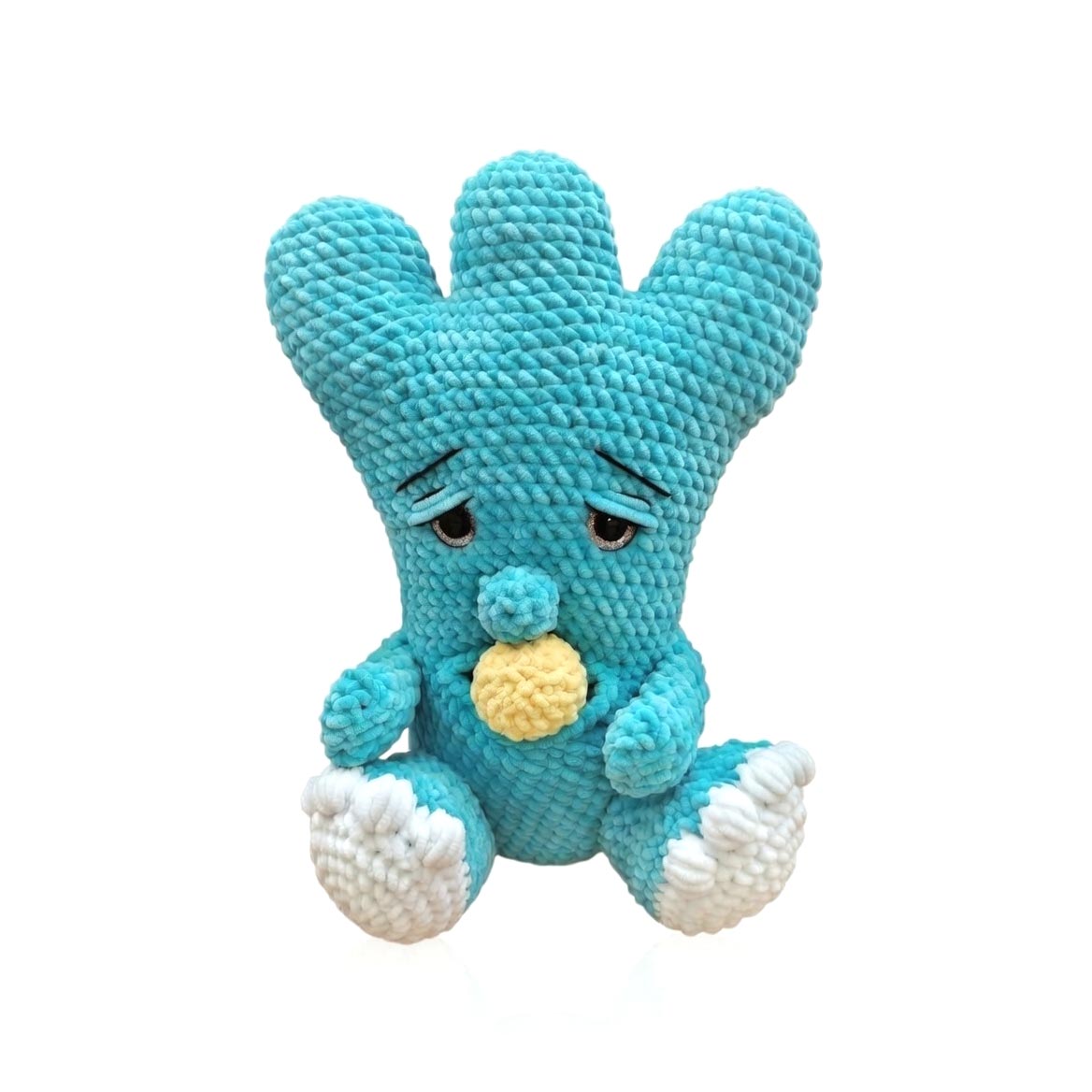 An original hand-crocheted toy in vibrant turquoise, which looks more friendly than scary thanks to its innocent expression and soft design. The monster features expressive eyes that give it character, and it holds a small yellow ball in its hands, adding to its playfulness.