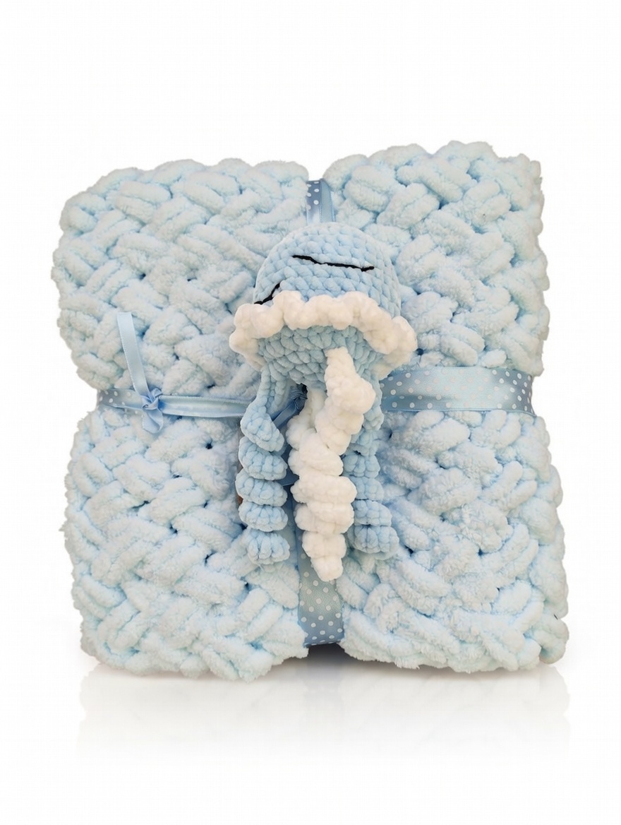 This set represents the perfect blend of functionality and playful design. The blanket provides warmth and comfort, while the detailed octopus figure gives the set a unique character. This precise handcrafted work is ideal as a stylish accessory for a nursery or a valuable gift for special occasions.