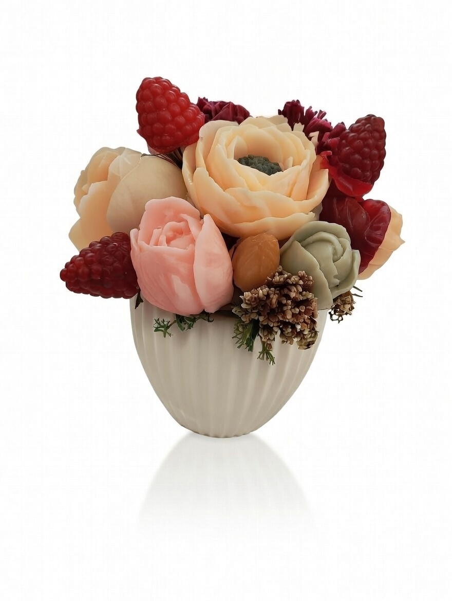 This handcrafted set is a perfect example of artistic creation. The ceramic vase with a subtle vertical relief provides stability and an elegant look that stands out in any interior. It is an ideal gift that brings not only visual delight but also a pleasant atmosphere thanks to its delicate aroma.