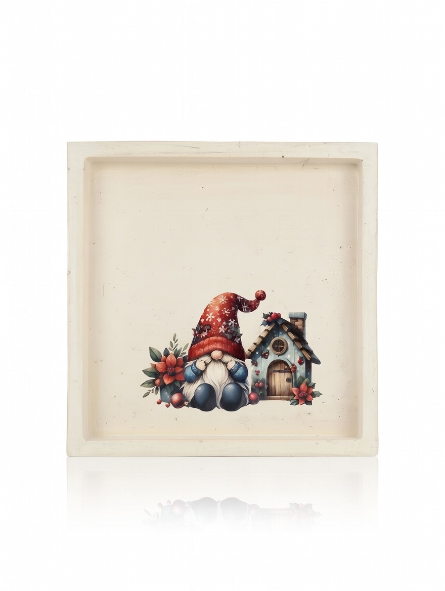 Add a touch of whimsical charm to your holiday decor with this square decorative tray. Featuring a delightful illustration of a Christmas gnome sitting by his snowy cottage, this tray is perfect for creating a festive scene anywhere in your home. The cream-colored base with its subtle texture provides a perfect backdrop for the vibrant holiday colors.