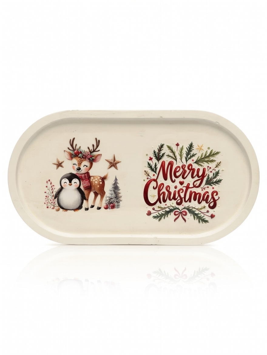 Spread holiday cheer with this charming decorative tray featuring a heartwarming illustration of a penguin and a fawn. Accompanied by a classic “Merry Christmas” greeting framed in evergreen sprigs, this tray is the perfect blend of cute and sophisticated holiday decor.